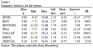 For this study we consider daily returns of seven stock market indexes, namely the U.S. Standard and Poor's 500 (SP500) is taken as a baseline market for comparison against six Latin American stock market indexes: Mexico (BMV), Brazil (BOVESPA), Chile (IPSA), Colombia (COLCAP), Peru (IGBVL) and Argentina (MERVAL). Daily closing prices from January 2nd, 2003 to January 8th, 2015, for a total of 3025 observations of each index were obtained from Bloomberg. The data was sampled for this period of time in order to capture the effects that the U.S. might have had on the Latin American equity markets during the sub-prime financial crunch and to have a broad view of other possible cross-bicorrelation phenomena. Prices were converted into a continuous rate of returns, taking natural log differences between consecutive daily closing prices of equity markets. Table 1 presents summary statistics for these returns. The statistics are consistent, as expected, with some of the characteristic particularities of financial variables [28,29]. In particular, the kurtosis indicates that return distributions are leptokurtic. Furthermore, the Jarque-Bera statistic (JB) confirms returns not normally distributed. Although the results of the KPSS test for seasonality are not listed, it does not reject the null hypothesis of seasonality or the results of the ADF and PP tests, under the null hypothesis of a unit root. Both tests with a 5% significance level are available upon request.