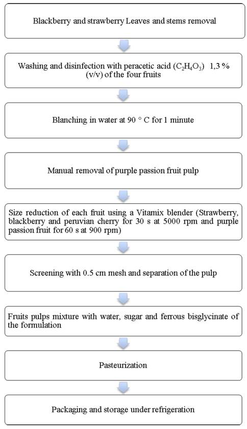After their characterization, the four fruits were processed to obtain an iron-fortified mixed drink, following the process diagram depicted in Fig 1.