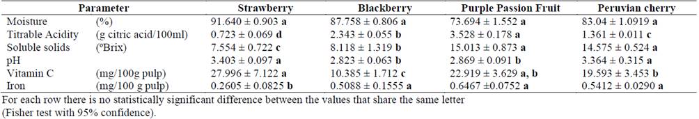 The selected fruits were characterized in triplicate, determining moisture content, pH, soluble solids, titratable acidity, color, iron and vitamin C content.