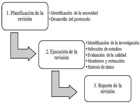 La Revisión Sistemática de la Literatura (RSL) permite realizar un estudio a profundidad para determinar la respuesta a una pregunta de investigación. Kitchenham [15] define tres pasos principales que permiten realizar un proceso de RSL formal, riguroso y fiable de investigación (ver Fig. 1) y que incluye: (1) Planificación de la revisión, (2) Ejecución de la revisión, y (3) Reporte de la revisión.