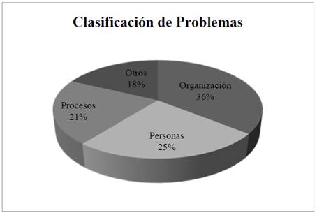 De la Taxonomía descrita por [14] podemos ver que para el despliegue de los procesos de GSTI, los problemas que se presentan (Tabla 7) están referidos o dependen principalmente de la Organización (36%) que se refleja en la Fig. 4.
