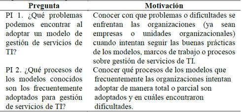 Para la realización de este estudio se estableció las siguientes preguntas de investigación (PI) que se pueden ver en la Tabla 1.
