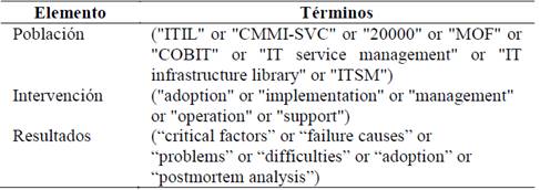 Intervención: Refiere a los elementos que se evalúan en la población bajo revisión. Para este estudio se trata de experiencias de adopción de los modelos de servicios, sin entrar al detalle del tipo servicio de TI para lograr una mayor amplitud de resultados.