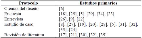 Los estudios primarios seleccionados fueron validados según los criterios de verificación de la calidad. Los 23 estudios provienen de ponencias en conferencias y revistas indexadas (Tabla 4). Se pudo encontrar que el protocolo más empleado en los estudios primarios fue el estudio de caso (Tabla 5) los cuales contribuyeron en el mayor número de problemas de adopción identificados.
