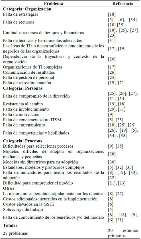 Luego de la revisión de los 23 estudios primarios sobre la adopción de modelos en GSTI, se extrajeron un total de 28 problemas o dificultades. La determinación de los problemas se obtuvo en algunos casos de manera explícita y en otros se infirió por el contexto de lo expresado en el estudio.