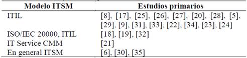 En la mayoría del conjunto de estudios seleccionados, las organizaciones tienden a utilizar el modelo ITIL, la mayoría adopta sólo algunos procesos. Además algunas utilizan ITIL como base para adoptar la ISO/IEC 20000 y obtener la certificación [26] (ver Tabla 8).