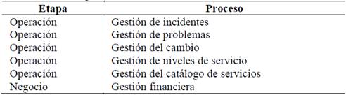Entre los modelos ITIL e ISO/IEC 20000, los procesos comúnmente adoptados fueron los que se relacionan a la operativa del servicio. Este hecho es comprensible considerando que la necesidad de las organizaciones suele ser mejorar el quehacer diario, lo que correspondería a la etapa de operación dentro del ciclo de vida del servicio (ver Tabla 9).