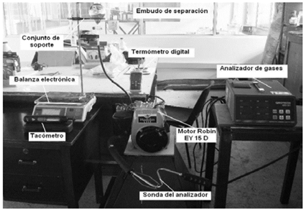 Equipo de medida . El consumo de combustible se mide con una balanza LEXUS de 0,5 g de resolución y un embudo de 300 ml. Se toman muestras de gases de escape a la salida del motor y se miden las emisiones de CO, CO2 y HC con un analizador de gases QRO-401; la velocidad del motor se mide con un tacómetro de contacto TMRT de la serie SKF; las temperaturas del motor en el bloque y la culata se miden con un termómetro digital FLUKE 54 II y dos termopares tipo K. La presión de compresión del motor se mide con un medidor de compresión Milton. En la Fig. 1 se ilustra la configuración experimental.
