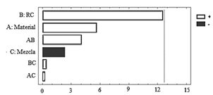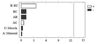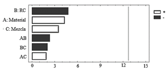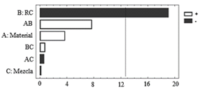 Análisis de emisiones de hidrocarburos. El análisis de varianza para hidrocarburos se presenta en la Tabla 8. Se observan diferencias significativas en el factor de RC, seguido por el factor de material de la culata y la interacción de estos dos factores. El diagrama de Pareto de la Fig. 14, confirma la fuerte influencia de la RC en las emisiones de HC. A diferencia del diagrama de Pareto para el CO2, la composición de la mezcla ejerce cierta influencia en los niveles de emisiones HC no quemadas. Incrementando el contenido de etanol en la mezcla, las emisiones de HC se disminuyen considerablemente en condiciones de ralentí.