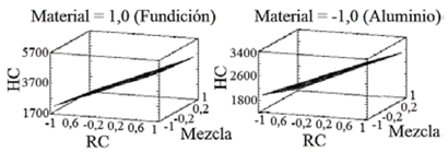 En la Fig. 16 se presenta la superficie de respuesta de las emisiones de HC en función de la RC y el material de la culata. Se observa que las pendientes de las emisiones de HC en función de la RC son más pronunciadas para la culata de fundición que para la de aluminio. La menor cantidad de emisiones HC (1438,57 ppm) se obtienen con una combinación de factores de culata de aluminio, mayor RC (7,2) y mezcla E20. La mayor cantidad de emisiones HC (4795,27 ppm) corresponde a la interacción de culata de fundición, menor RC y mezcla E20.