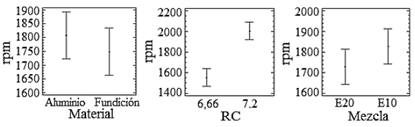 En las gráficas de medias de la Fig. 3, con respecto al material de la culata y la composición del combustible, se observa que las medias correspondientes de consumo de combustible son muy cercanas. Para el factor de RC, hay una ligera diferencia en las medias de consumo.