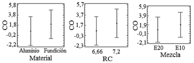 En la Fig. 9 se ilustran las medias de las emisiones de CO. No es posible a partir de las imágenes detectar una diferencia significativa entre las medias de CO generados por los niveles bajos y altos de los factores estudiados.