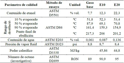 Combustibles de prueba. Un motor es optimizado en fábrica para el combustible con el que presumiblemente operará. Sin embargo, en los motores pequeños industriales y estacionarios a los que se refiere esta investigación no se realizan, de forma general, modificaciones para aprovechar las ventajas del etanol en las mezclas etanol-gasolina. Aparte de esto, los servicios post-venta no prevén ajustes según el combustible dispuesto por el usuario. En general, los fabricantes de motores pequeños no asumen responsabilidades de garantía por la regularidad de operación de los motores alimentados con mezclas etanol-gasolina y los usuarios son los responsables de realizar los afinamientos, sin que se siga un instructivo recomendado y probado en algún banco de regulación. Son los técnicos de servicio quienes, con su experiencia más que con capacitación formal, realizan los afinamientos de motor cuando operan con combustible no previsto por el fabricante. Las mezclas etanol-gasolina utilizadas en este trabajo fueron E10 y E20. El "E" se refiere al etanol en volumen en la mezcla, y el "10" se refiere a 10 % de etanol, gasolina al 90%. Cuanto mayor sea el contenido de etanol en la mezcla, admitida al motor, mayor será el contenido de oxígeno en ella y, de no efectuarse las correcciones en el sistema de carburación, habrá cambios en la riqueza de la mezcla a medida que aumenta el contenido de etanol en el combustible. Para la preparación de las mezclas, se utilizó la gasolina comercial (provista al laboratorio) junto con alcohol etílico de 99,7% de pureza [28]. Las mezclas se prepararon diariamente para minimizar cualquier posibilidad de cambio de contenido causado por evaporación o humedad atmosférica. Las propiedades de los combustibles utilizados se muestran en la Tabla 1.