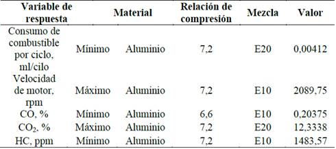 Las combinaciones óptimas de los factores para el motor estudiado, bajo condiciones de operación en ralentí se resumen en la Tabla 11. Las propiedades térmicas del aluminio y la mayor RC favorecen el desempeño del motor y la reducción de las emisiones.