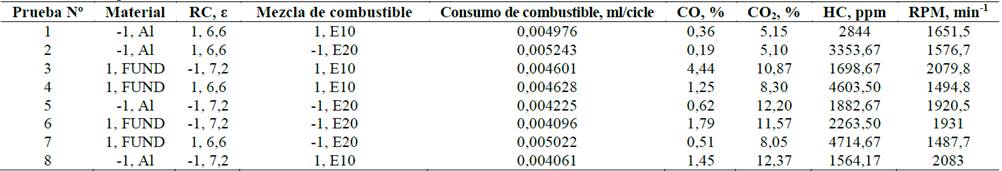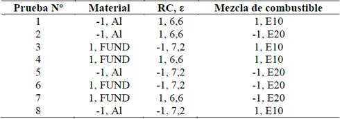 Para la prueba de sensibilidad del comportamiento global del motor a los cambios en la conductividad de las paredes, la RC y la composición de la mezcla de etanol-gasolina, se eligió una metodología de screening (cribado). Para obtener el modelo empírico basado en experimentos factoriales, los parámetros operativos fueron codificados desde un bajo nivel de operación de -1 a un nivel de operación alto de +1. Todos los ensayos del motor (experimentos con sus réplicas) se hicieron sin realizar ajustes a los dispositivos controladores de mezcla en el carburador, ni al ángulo de avance del encendido (se trabajó con los ajustes recomendados para operación con gasolina regular), independientemente del cambio de los factores. En el diseño factorial completo se realizan ocho ensayos con ocho repeticiones para cada uno de ellos, como se describe en la Tabla 2.