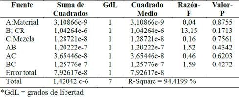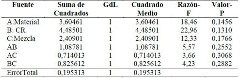 Después de procesar las respuestas de los 8 ensayos realizados para cada prueba, el resumen de los resultados se presenta en la Tabla 3. El análisis estadístico de los resultados del diseño de experimentos (DOE), explicado en esta sección, se realiza utilizando el programa computacional Statgraphics®, tomando cada variable de respuesta (consumo de combustible, variación de revoluciones, emisiones de escape y tiempo de calentamiento del motor en ralentí) en función de los factores (RC, material de la culata y composición del combustible). El análisis utiliza la tabla de análisis de varianza (ANOVA), el gráfico de Pareto, la media cuadrática y las superficies de respuesta. Se consideró un p-valor de 0,05 para la valoración de los factores estadísticamente significativos.