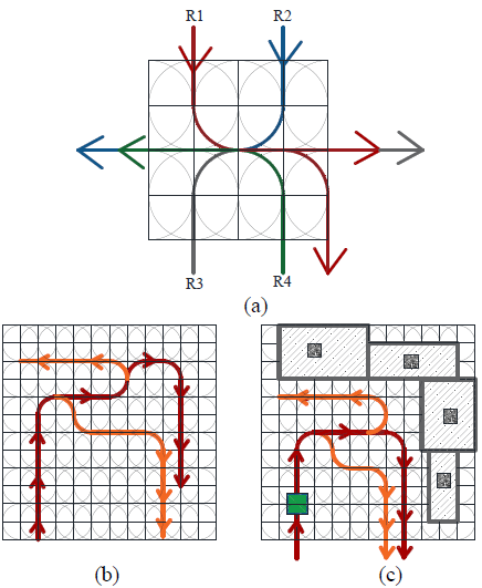 Figure. 6 Representation of route flows for transport and maintenance systems. a) Flexible route design, b) Flexible layout design, c) Flexible route design in an area with equipment and machinery.