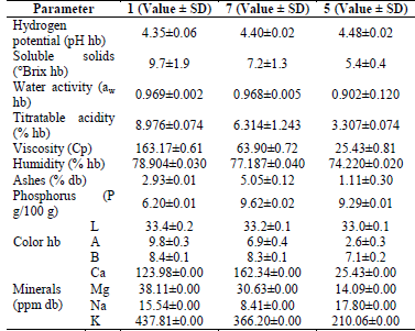 As seen in Table 2, pH increases in formulations with lower pulp content due to the addition of water that influences on this parameter. Soluble solids, humidity, acidity percentage, and viscosity diminish with the addition of water, which solubilizes them and diminishes their concentration. Water activity is high, which would permit the development of the microorganism. Mineral content is adequate for its incorporation in the chayote matrix.