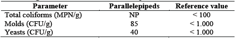 Table 4 shows that the final product had 0 MPN/g for total coliforms, and 40 CFU/g in the seeding for yeasts and 85 CFU/g molds. According to resolution 2155 of 2012, the final food is within the permissible limits for dry or dehydrated vegetables, which is of 103 CFU/g, indicating that the product obtained complies with the norm established.