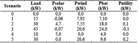 Table 1 presents the 5 simulated microgrid scenarios, including scenario 0 that corresponds to the microgrid disconnected from the electrical distribution system. For scenarios 1 to 5 the battery was 100%.
