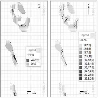 In the 6th, 10th and 11th months there was a large variation in the dilution results with values considerably lower than the maximum values. This fact indicates that these very distinct values may have occurred in isolated areas. Fig. 5 shows the blocks planned to be extracted in the 10th month (right side - dilution legend (P90); left side - rock types). In contrast to the previous analysis (of the 8th month), the areas with the highest dilution were in this case concentrated at specific points, which leads to the conclusion that it is possible to correct the mining plan at these specific locations.