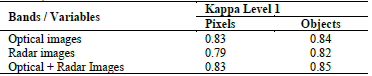 The results obtained for thematic accuracy at level 1 are shown in Table 5 and Fig. 6, using the 90% of the CAR dataset, reveal that, firstly, the best global thematic accuracy is obtained from integrated radar and optical images, implementing the object-oriented approach resulting in a kappa index of K = 0.85. Secondly, we observed that the object-oriented approach applied to optical images presents with K = 0.84. Thirdly, it was found that the pixel-based approach from both optical images and integrated optical and radar images share the same accuracy at K = 0.83.