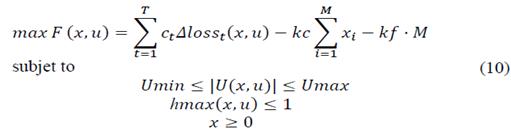 Where c t is the cost of losses in the load state t ($/kW) and ∆loss t (x, u) is the saving of losses in the t load state due to the installation of capacitors with sizes x on the u locations. The annual cost of capacitors is represented by the units cost kc($/kvar), and the fixed cost per capacitor bank kf ($/bank). Besides, M is the number of capacitors.