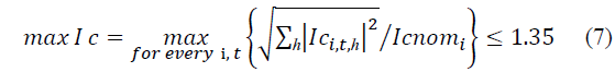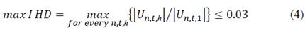 Taken into account the recommendations of the IEEE Std. 519-2014, other voltage quality constraints are applied on the maximum distortion indexes THD and IHD in every node, load state and harmonic (n,t,h). These indices must comply with 5% and 3% limits respectively in medium voltage level.
