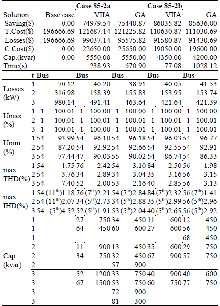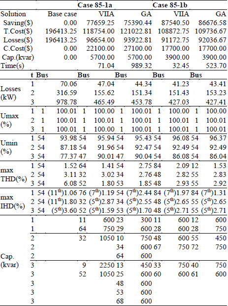The first case (85-2a) includes the constraint of minimum voltage of 0.9 pu. The proposed solution reaches the 99.4% of saving of the GA’s solution by using the same amount of capacitor units. The presented method employs the 35.6% of the GA’s computation time.