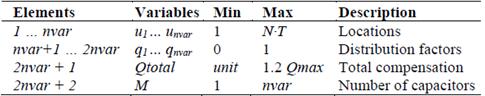 The independent variables of the problem are the vectors x and u of length (Mx1) that represent respectively the sizes and locations of the capacitors. The elements of u are integers limited to the number of the possible locations, while the elements of x are the standard sizes of the capacitors placed in the u locations.