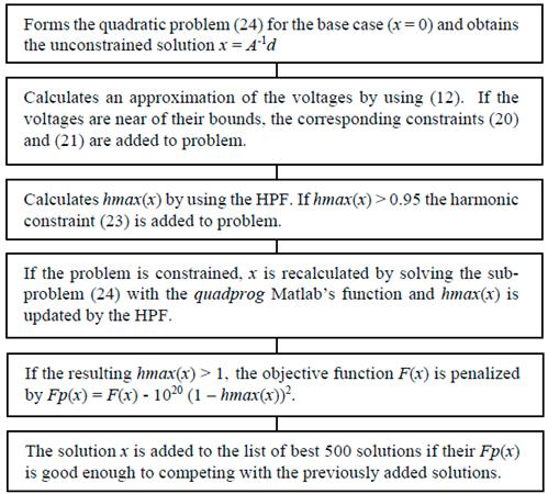 These 500 solutions have been obtained by only the first iteration of the SQP method. Thus, they are approximate solutions that have not been tested by the fundamental frequency load flow (FFLF) and the harmonics penetration function (HPF). Then, each solution of the list is improved by the function SQP2, which implements the final iterations of the SQP method, until a convergence of the capacitors sizes is achieved. The best of the obtained solutions is selected as optimal.