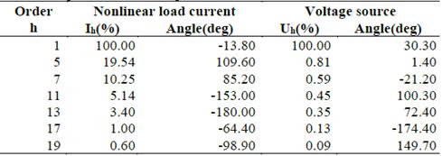All loads are modeled as constant active and reactive power at fundamental frequency, while at harmonic frequencies; the linear load is modeled by the series RL circuit [26] and the nonlinear load current is represented by the harmonics’ spectrum of Table 1.