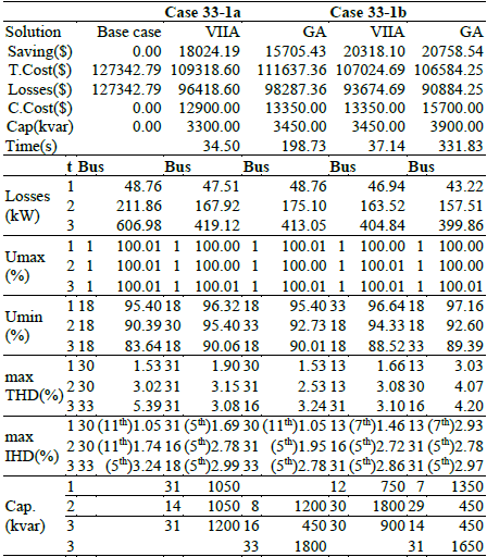 In the second case (33-1b) (voltage unconstrained), the proposed solution is inferior in 2.1% respect the GA’s solution. The proposed solution uses the 88% of capacitors’ units and is obtained in just an 11.2% of the GA’s computation time.