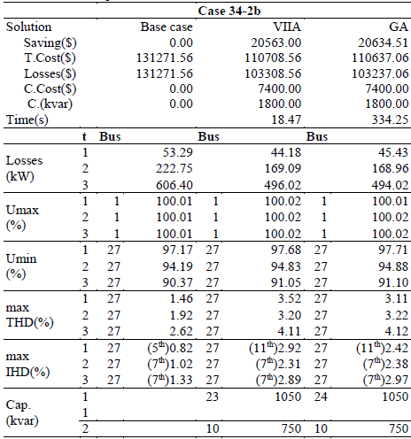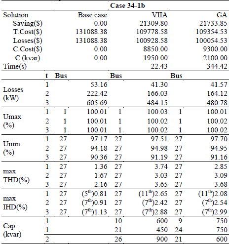 In the second example (34-2b) with results shown in Table 4, the 20% of load in nodes 17-26 is nonlinear. Thus, the 10% of total load is nonlinear. Although the harmonic distortion is incremented, the base case complies with the IEEE-519’s distortion limits. The proposed solution is only 0.35% inferior to the GA’s solution but is obtained in just a 5.5% of the computation time employed by the GA.