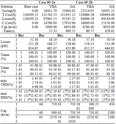 In the second case (69-2b), the proposed solution is inferior in 3.7% and uses the 103.7% of capacitor units with respect the GA’s solution. The solution is obtained in the 18.8% of the GA’s computation time.