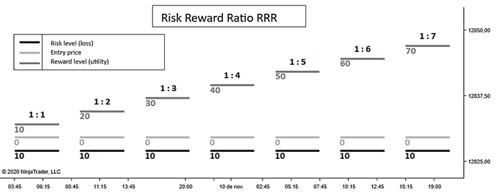 Fig. 5 shows the scheme of each of the proposed RRRs, starting at 1 to 1. This indicates that for each unit of risk (stop) that is decided to assume, at least one unit of reward (profit) will be obtained, the measurement covers up to the ratio 1 to 7. It is considered that as the RRR increases, the probabilities of obtaining it decrease.