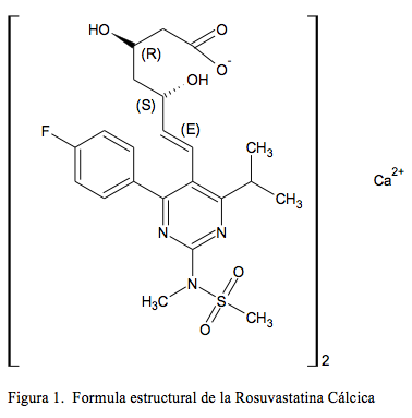 El nombre (IUPAC) sistemático de la ROSUCa es: Calcium (E, 3R, 5S)-7-[4-(4-(4-fluorophenyl)-2-(methyl-methylsulfonylamino)-6-propan-2-ylpyrimidin-5-yl)-3,5 dihydroxyhet-6-enoate, que corresponde a la formula condensada CaH54F2N6O12S2 cuya fórmula estructural se presenta en la Figura 1.