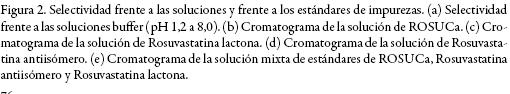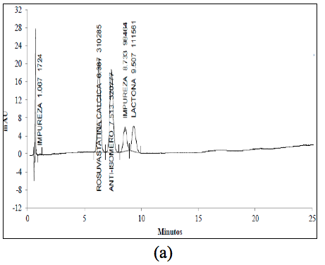 Para verificar la idoneidad del sistema se preparó una solución de ROSUCa a una concentración de 0,2 mg/mL, que se sometió a hidrólisis ácida con el objetivo de generar el producto de degradación de Rosuvastatina Anti-isómero. La resolución entre ambos picos fue mayor a 2,0, el número de platos teóricos (N) fue mayor a 1500, el factor de cola fue menor de 2,0, y el coeficiente de correlación para la curva de calibración de estándar fue mayor a 0,99. Los valores obtenidos cumplen con los criterios establecidos en el capítulo 621 de la USP 36 [13].