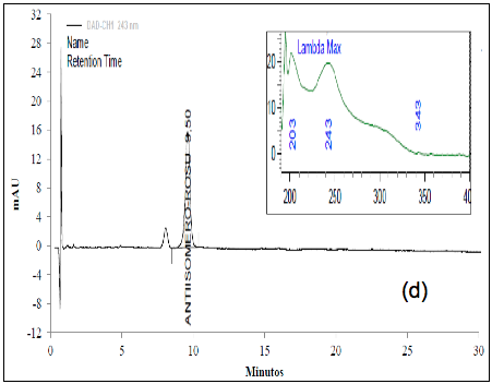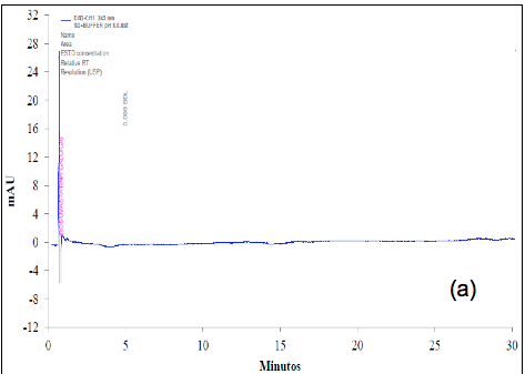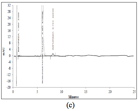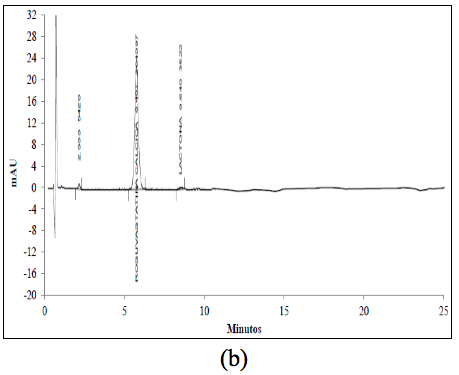 Tomando como referencia la bibliografía consultada [6,8,11] y después de realizar diversas modificaciones a las condiciones cromatográficas, se seleccionaron las siguientes: columna C18 encapada, de 50 x 4,6 mm y 3,5 micrómetros de tamaño de partícula, el flujo de 1,0 mL/min, 30°C de temperatura, y 10 µL de volumen de inyección. La fase móvil fue MeOH: Agua- 0,1% TFA, (1:1). Se empleó un detector UV-DAD con una longitud de onda fija de 243 nm.