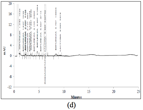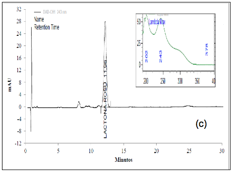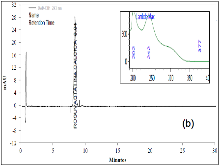 El cromatograma correspondiente a la hidrólisis ácida (Figura 3a) presenta cuatro señales: aproximadamente a los 6,4 min., aparece la señal correspondiente a la ROSUCa; y con TRR de 1,18, 1,37 y 1,49 min, aparecen los posibles compuestos de Rosuvastatina Anti-isómero, Rosuvastatina Anti-isomero Lactona y Rosuvastatina Lactona respectivamente. Estos compuestos coinciden con los reportados en la literatura bajo las condiciones descritas [14]. Esta solución fue evaluada por espectrometría de masas, en donde se encontró que la señal correspondiente a la ROSUCa presenta un pico base con m/z de 482, que coincide con el peso molecular de la ROSU, la señal correspondiente a la Rosuvastatina Anti-isómero produce un pico base con m/z 482 y la señal correspondiente a la Rosuvastatina Lactona produce un pico base con m/z 464, debida a la ciclación entre el grupo OH y el grupo carboxílico y la pérdida de una mol de agua para producir la lactona correspondiente. La señal presenta un pico base con m/z 464, posiblemente corresponde al compuesto Rosuvastatina Anti-isomero Lactona [15]. En los espectros ultravioleta para la ROSUCa y los productos de degradación mayoritarios bajo las condiciones ácidas, se observa un similar máximo absorción a los 243 nm (Figura 2b, c y d).