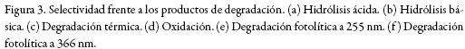 La selectividad se evaluó respecto a la solución diluyente y frente a soluciones de diferentes pH como 1,2, 2,5, 3,5, 4,5, 6,8 y 8,0. Además, se realizó la degradación forzada del fármaco en condiciones ácidas, básicas, oxidativas (Peróxido de hidrógeno), en luz solar directa y bajo luz ultravioleta a 255 y 360 nm.