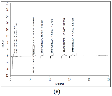 El análisis de los cromatogramas obtenidos para evaluar la selectividad frente a las soluciones buffer, frente a soluciones de estándar de impurezas como: Rosuvastatina anti-isómero y Rosuvastatina Lactona, y frente a soluciones de muestra en diferentes condiciones de degradación, como fueron condiciones ácidas, básicas, calor, oxidativas, y fotolíticas, permiten concluir que las soluciones y los productos de degradación generados bajo cada una de las condiciones no interfieren con la señal correspondiente al activo (Figura 2 y Figura 3).