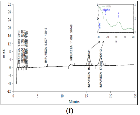 La ROSUCa en solución resultó ser muy inestable cuando se somete a una radiación de 255 nm, originando dos productos de degradación principales con un porcentaje de 6,8% y 6,1% y tiempos de retención relativos de 2,34 y 2,71, respectivamente. Los porcentajes de los productos de degradación cuando se somete la ROSUCa a una radiación de 366 nm son de 46,6% y 42,8% y los espectros obtenidos presentan un máximo de 314 nm (Figura 3f). Estos productos se pueden deber a la transformación fotoquímica de la ROSUCa en solución acuosa, proceso que ha sido estudiado y ha permitido la identificación de cuatro productos de degradación, dos de los cuales son mayoritarios y consisten en una mezcla diastomérica de dos especies, las cuales presentan una máxima absorbancia en el espectro UV a 314 nm [16]. Los dos diastero-isómeros formados presentan la misma masa molecular de la ROSUCa con un ión molecular con m/z 482 [14].