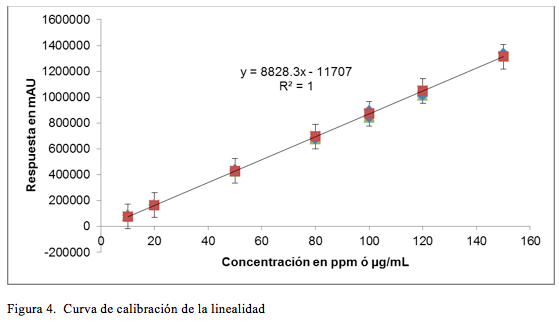 La Figura 4 muestra la curva de calibración para la linealidad, según las guías ICHQ2(R). Como se muestra en la Tabla 2, la prueba t para un nivel de confianza del 95% y n-2 grados de libertad indican que estadísticamente hay proporcionalidad entre la concentración y la respuesta analítica para el rango comprendido entre 10 y 150 ppm. También muestra que la pendiente es estadísticamente diferente a cero y el intercepto no es estadísticamente diferente de dicho valor. Todo lo anterior indica que para el modelo lineal propuesto, los errores sistemáticos no afectan la linealidad.