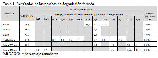 En la Tabla 1 se resumen los porcentajes de degradación obtenidos para cada señal y el porcentaje de degradación remanente para la ROSUCa, así como los TRR (Tiempos de retención relativo) para cada compuesto de degradación y la pureza espectral de pico de la ROSUca. La ROSUCa resultó ser estable en condiciones básicas y térmicas.
