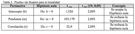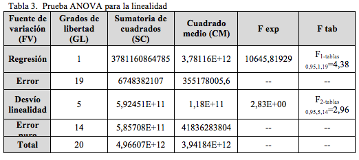 Los resultados de la prueba ANOVA (Tabla 3), indican que no hay dispersión estadísticamente significativa entre los resultados de las réplicas de las distintas concentraciones, corroborando el cumplimiento de la linealidad de la metodología.