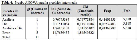 Como se muestra en la Tabla 4, el análisis de varianza, mediante un test F para la precisión intermedia, indica que no se presentan diferencias estadísticamente significativas por realizar el análisis en días diferentes o con analistas diferentes [17].