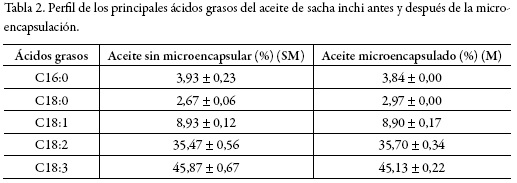 Mediante cromatografía de gases se cuantificó el contenido de ácidos grasos del aceite de sacha inchi antes y después del proceso de microencapsulación. Estos resultados se presentan en la tabla 2.