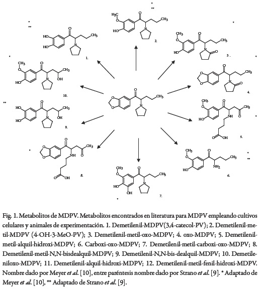 Usando microsomas hepáticos y fracciones celulares S9 hepáticas humanas para CYP450 de fase I, y las enzimas uridina 5(-difosfoglucuronosiltransferasa) y sulfotransferasa para fase II, Strano et al. evaluaron el metabolismo de MDPV in vitro. La identificación de los metabolitos se realizó por medio del análisis de sus derivados TMS por GC-MS y análisis de sobrenadantes por cromatografía líquida con analizador de cuadrupolo y tiempo de vuelo (LC-QTOF). Como ruta de biotransformación se propone una vía metabólica similar a la de MDMA, la cual consiste en la apertura del anillo metilendioxi seguido por O-desmetilación a fin de producir un grupo catecol, que posteriormente es metilado por acción de la catecol-O-metiltransferasa (COMT). El autor presenta dos principales metabolitos de MDPV: 3,4-dihidroxipirovalerona (3,4-catecol-PV), producto de la O-desmetilenación del anillo 3,4- metilendioxi, y 4-hidroxi-3-metoxi-pirovalerona (4-OH-3-MeO-PV), resultado de la O-metilación de 3,4-catecol-PV. En la figura 1 se pueden apreciar los principales metabolitos de MDPV encontrados en la literatura consultada. Los experimentos sobre el metabolismo de fase II demostraron que estos metabolitos se conjugan por sulfatación (50%) y glucuro-nidación (40%). Asimismo, las muestras sometidas a metabolismo de fase I y fase II mostraron que aproximadamente el 7% se metaboliza a 3,4-catecol-PV, el 10% a 4-OH-3-MeO-PV, y el 80% de MDPV permanece inalterado, aunque mencionan los autores que este porcentaje puede deberse al exceso de MDPV añadido a las muestras [9].