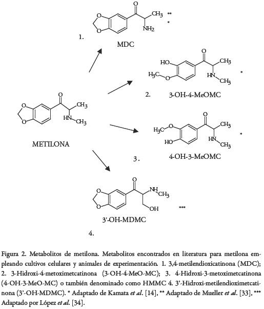 López-Arnau et al. confirmaron la presencia de MDC, 4-OH-3-MeO-MC y 3-OH-4-MeO-MC. Mediante LC/MS y LC-MS/MS determinaron las concentraciones de estos metabolitos en plasma de ratas después de la administración oral de metilona. Además, los autores proponen rutas metabólicas como A-desmetilación, hidroxilación alifática o la desmetilación de un intermediario que por O-metilación en posición 3 ó 4 forma 4-OH-3-MeO-MC ó 3-OH-4-MeO-MC, respectivamente. Tanto Kamata, como López, identifican 4-OH-3-MeO-MC y 3-OH-4-MeO-MC, dos compuestos que tienen la misma fórmula química (C11H15NO3) y espectro de masas, y debido a la posición del grupo hidroxilo presentan diferentes tiempos de retención. López describe otro metabolito que corresponde a 3'-hidroxi-metilendioximetcatinona (3'-OH-MDMC), de fórmula C11H13NO4, resultado de hidroxilación alifática [34].